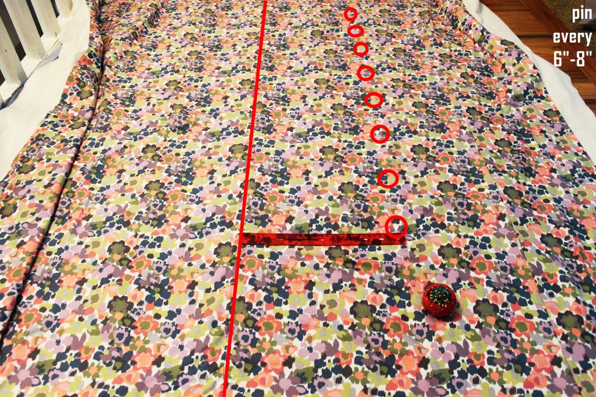 Lay your fabric out flat again. Smooth and pull everything taut. Use a ruler to plant your pins a specific distance from the center line (example used 12”, although I’d recommend 10” for a more centered look).