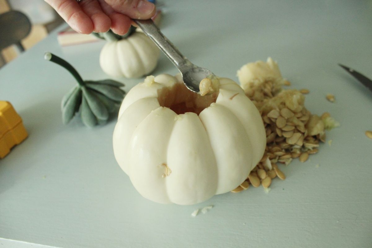 I love the look of a succulent’s “growing” out of a miniature white pumpkin.