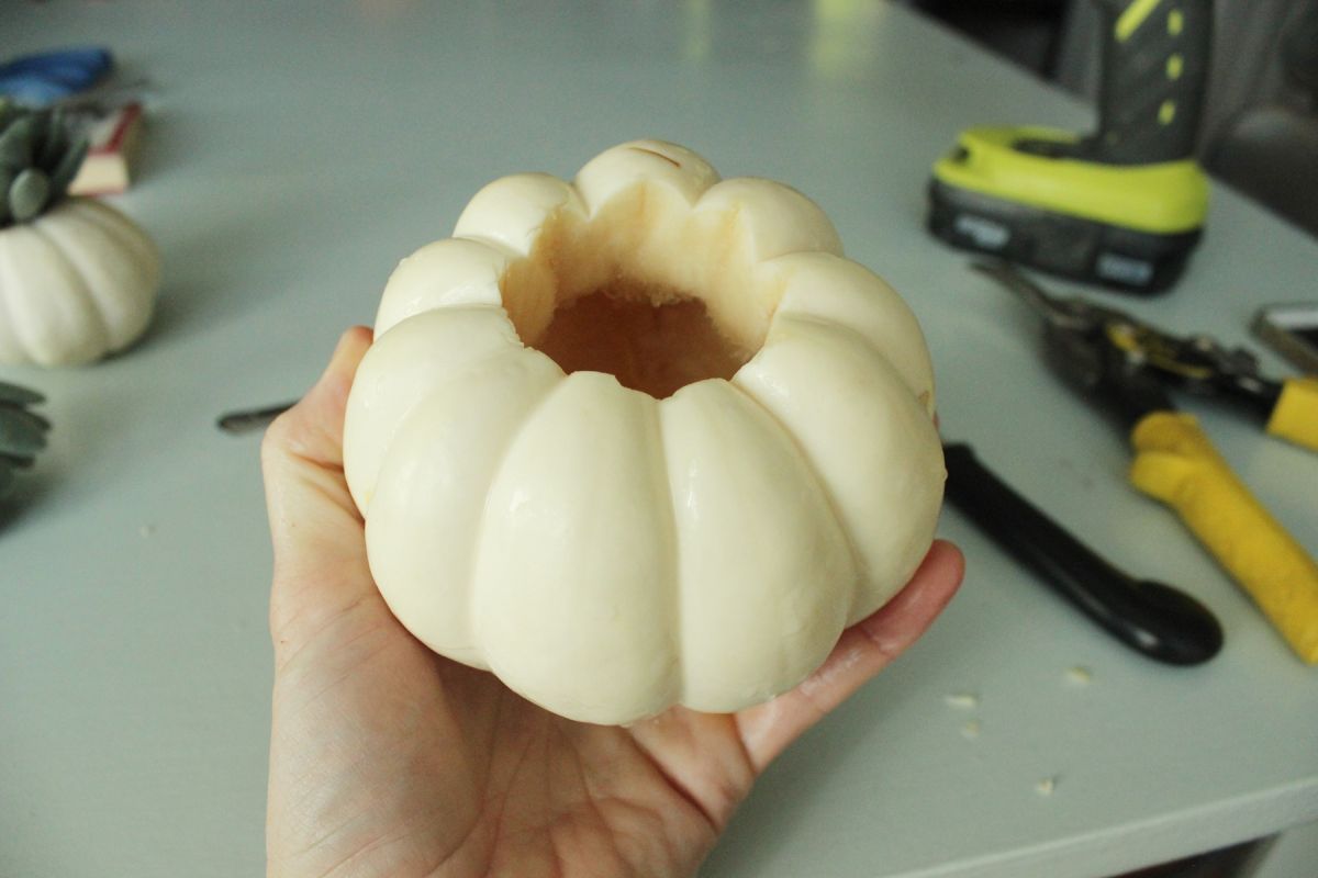 If your mini pumpkin is slightly bigger than the succulent, however, you might want to make a few adjustments, because the shell is thicker and requires a slightly larger hole.